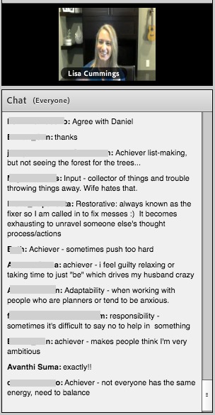 In addition to considering the inspirational application each time, they also look at their shadow sides. As you can see from this chat box, they’re discovering how their talent themes can also be troublemakers for them. Besides giving them personal self-awareness, it also helps them build patience for the situations when their direct reports are overusing or misapplying their talents.